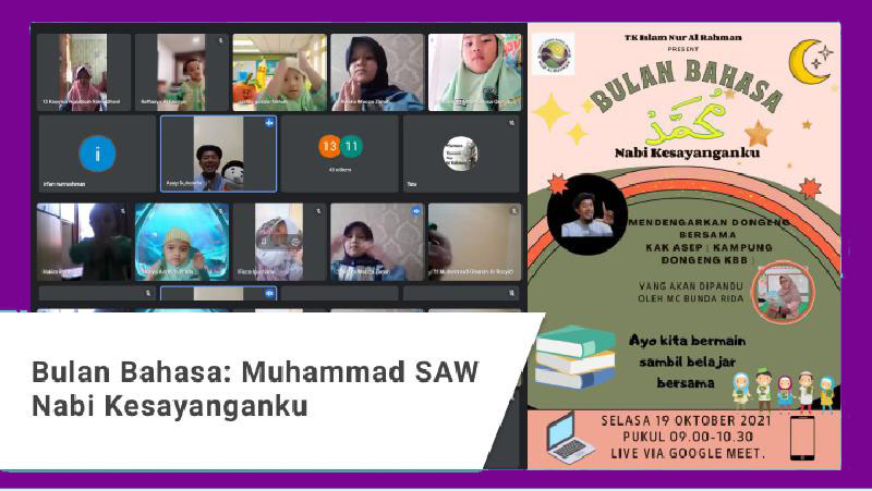 Kegiatan "Bulan Bahasa : Muhammad SAW Nabi Kesayanganku" dilaksanakn melalui Google Meet pada tanggal 19 Oktober 2021 pukul 09.00 - 10.30. Kegiatan yang dipandu oleh Bunda Rida tersebut berjalan dengan lancar karena anak-anak dapat bermain sambil belajar bersama pemateri yang luar biasa yaitu Kak Asep. Selama kegiatan berlangsung anak-anak mendengarkan dongeng bersama Kak Asep. Selain mendengarkan Kak Asep berdongeng, anak -anak juga aktif mengikuti arahan dan aktif bertanya sehingga kegiatan berjalan dengan penuh keceriaan.